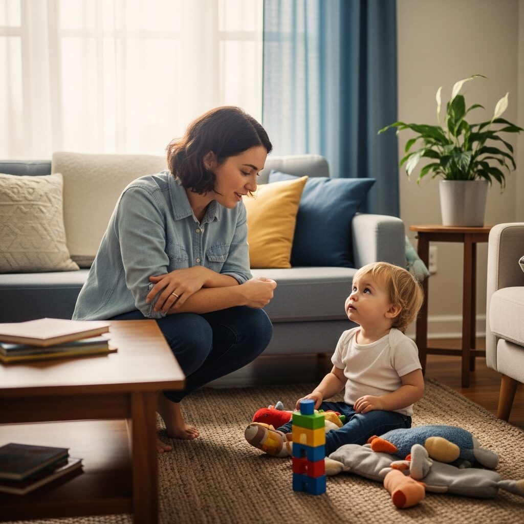 Toddlers process short, clear instructions better than long explanations. Instead of saying, “Stop running because you’ll fall and get hurt,” try “Walking feet inside.” Clear expectations help toddlers understand boundaries without confusion.