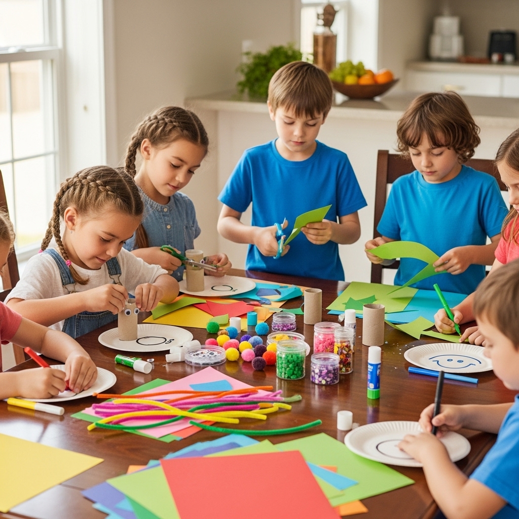 Paper plates turn into masks, animals, steering wheels, or planets with just markers, glue, and scraps. This low-cost craft boosts creativity and imagination.