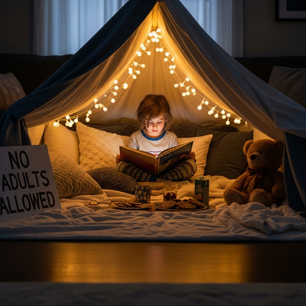 Make a cozy hideout using blankets, chairs, cushions, or a small tent. Add books and a flashlight. Kids love the cozy feeling and often stay inside reading or playing quietly.