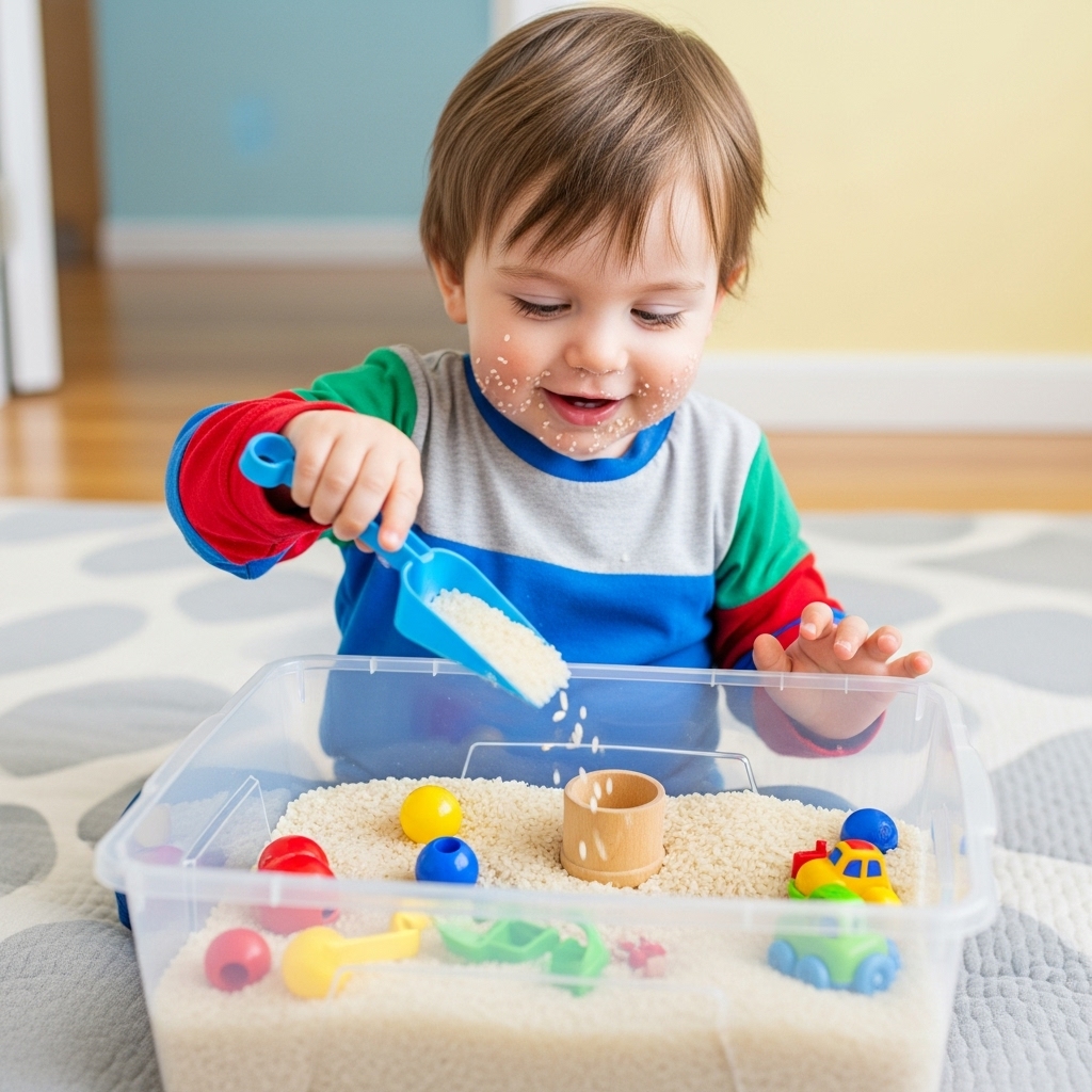 You don’t need fancy fillers. Use rice, pasta, beans, water, or pom-poms. Add cups, spoons, and small toys and let kids scoop, pour, and explore. Sensory play helps calm kids and keeps them engaged for long stretches.