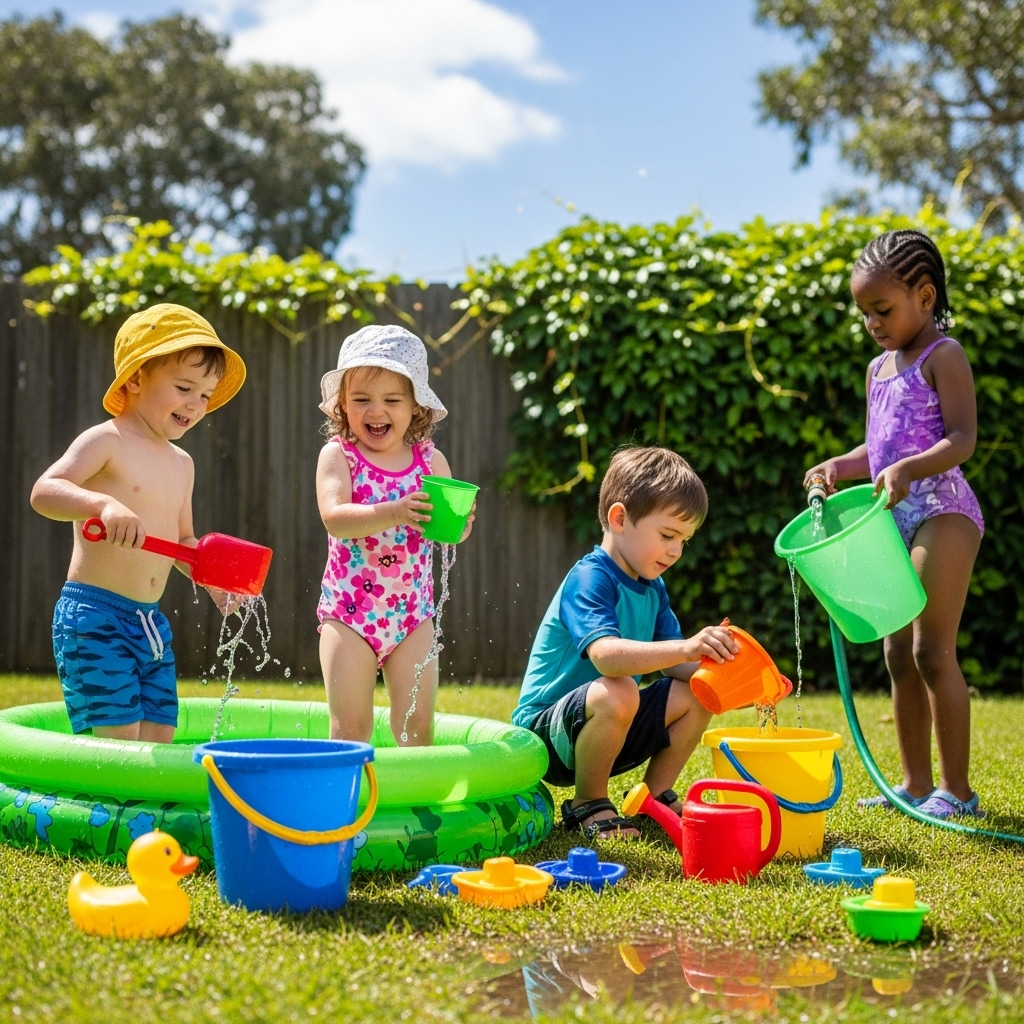 A bucket of water, cups, ladles, and sponges = instant fun. Water play is soothing for kids and keeps them busy for long periods.