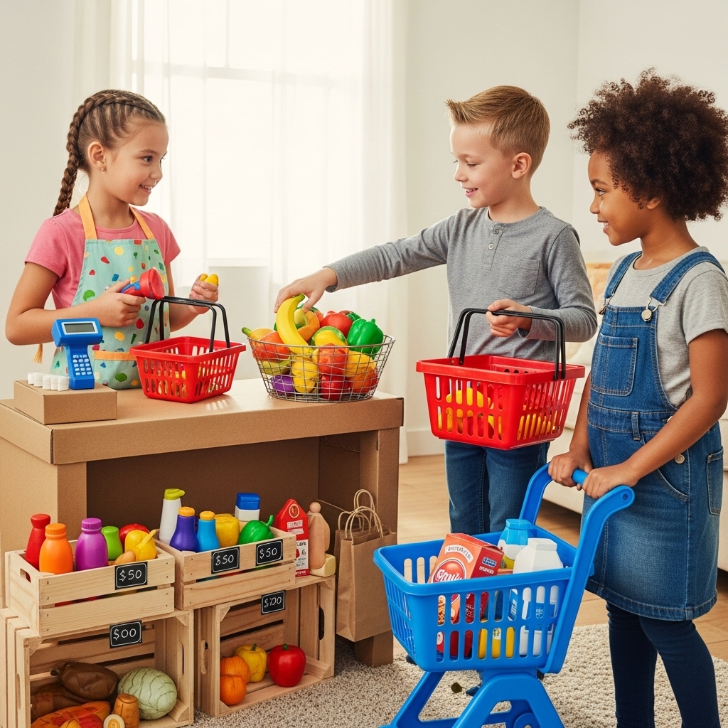 Create little scenes: a grocery store, doctor’s clinic, kitchen, or car wash. Use toys and simple props. Pretend play builds language, social skills, and imagination.