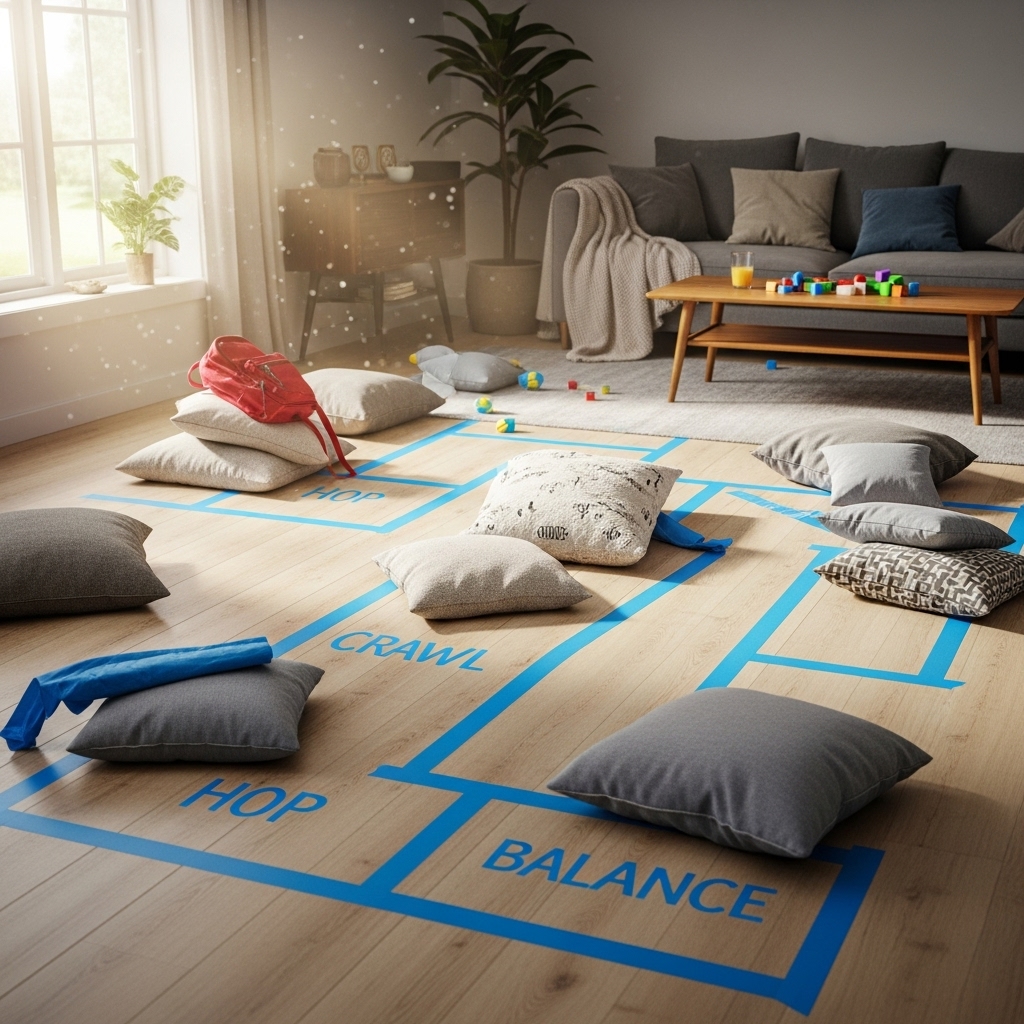 Use pillows, chairs, tape, and blankets to create a fun obstacle course. Kids can jump, crawl, balance, and race through it. Perfect for burning energy on rainy days.