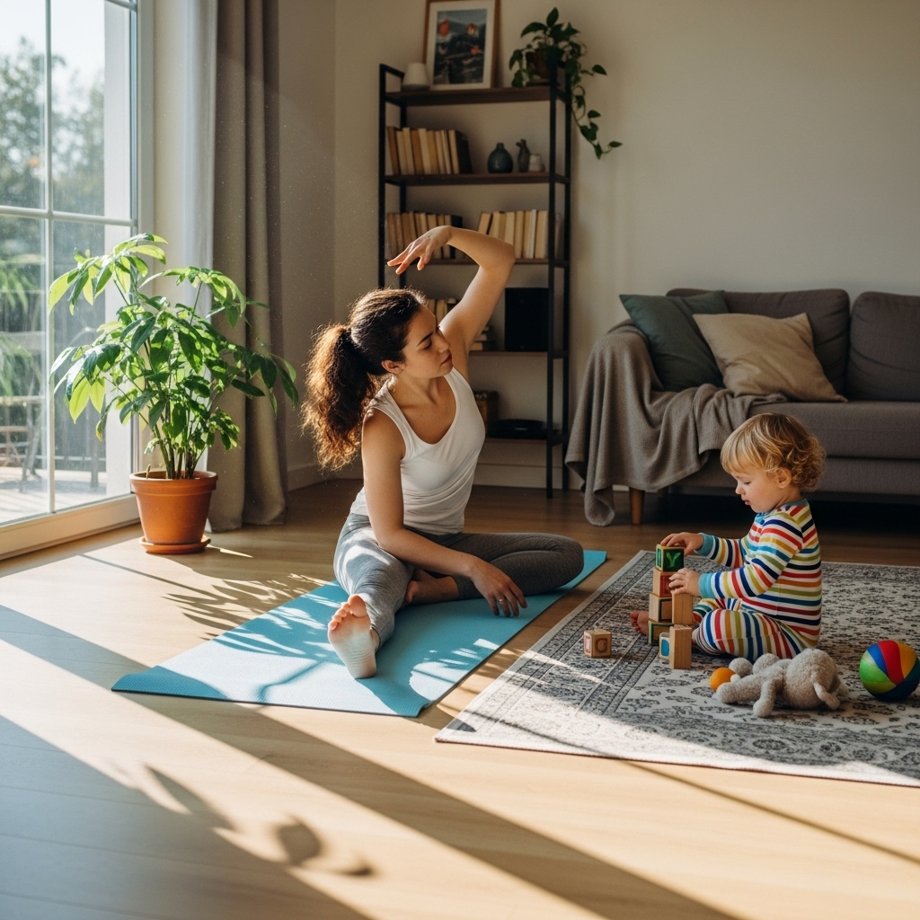 Exercise isn’t about perfection — it’s about energy and mood. Take a short walk with your baby in the stroller, dance in the living room, or do a 10-minute yoga stretch while your toddler naps. Moving your body releases stress and helps you reconnect with yourself.