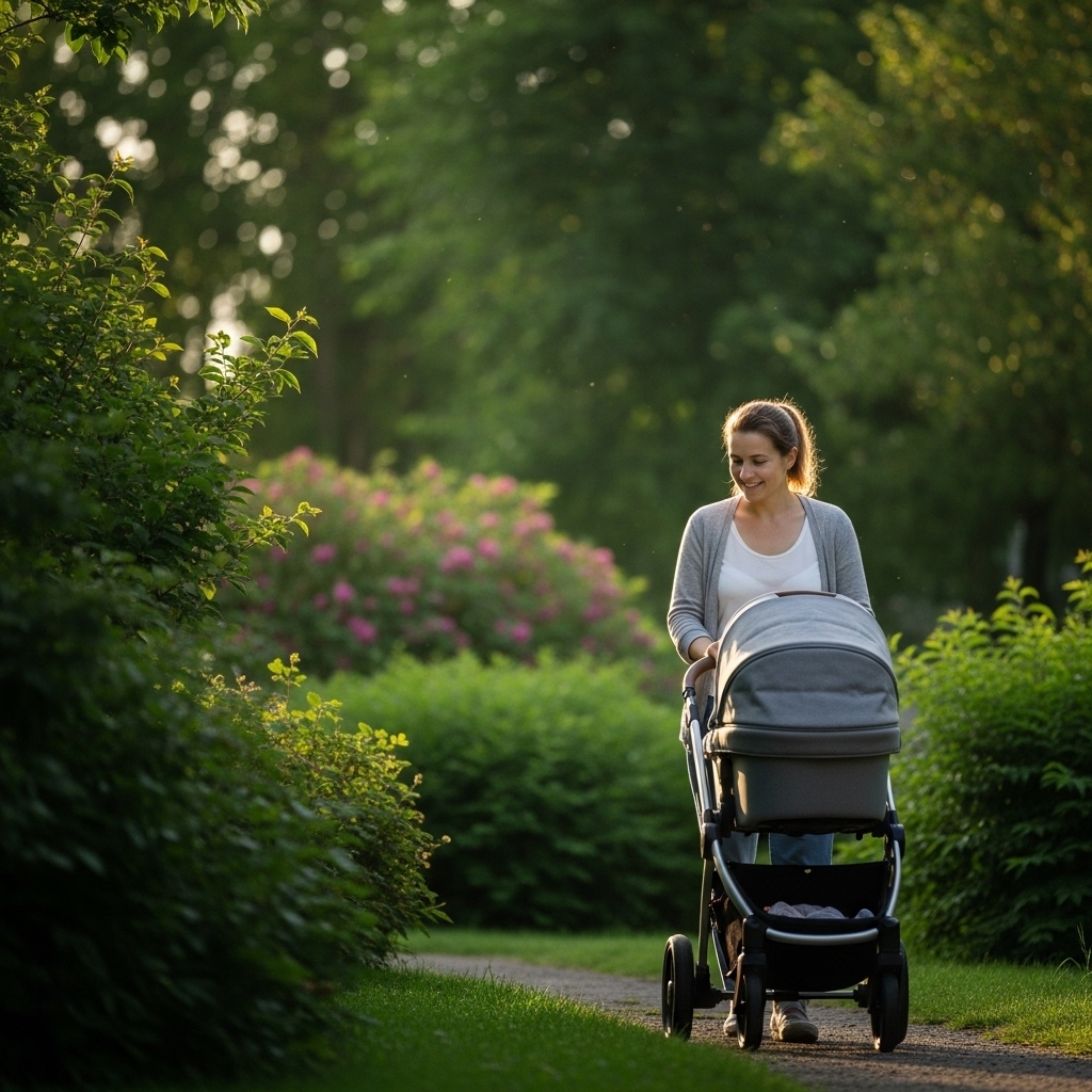 Image Prompt: mom taking a peaceful walk outdoors with a stroller, greenery, relaxed pace, natural lifestyle photography.